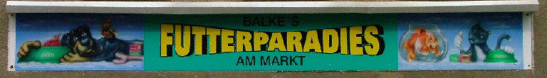 Werbeschild einer Tiernahrung Handlung. Die Bilder zu beiden Seiten sind von mir mittels Airbrushtechnik gestaltet worden. Der Schriftteil wurde von einer anderen Firma mittels Plotterschrift geklebt.